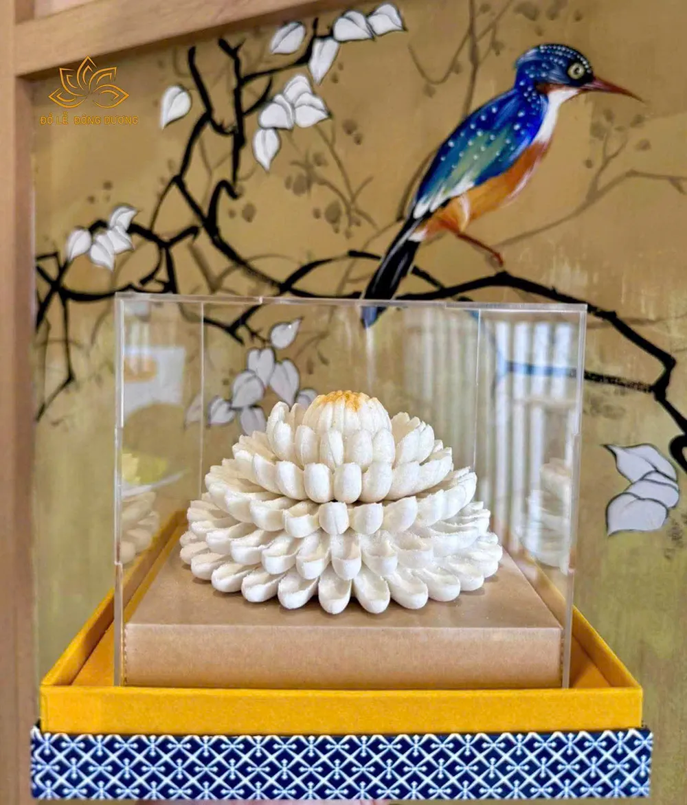 Oản hoa cúc trắng mang năng lượng tinh khiết – an lành – thanh tịnh, phù hợp dâng Phật – Thánh – Mẫu và gia tiên trong các dịp lễ tạ, cầu an, sóc vọng, lễ trọng. Màu trắng biểu trưng cho sự trong sáng, tịnh tâm, giúp không gian thờ trở nên trang nghiêm và thanh thoát.